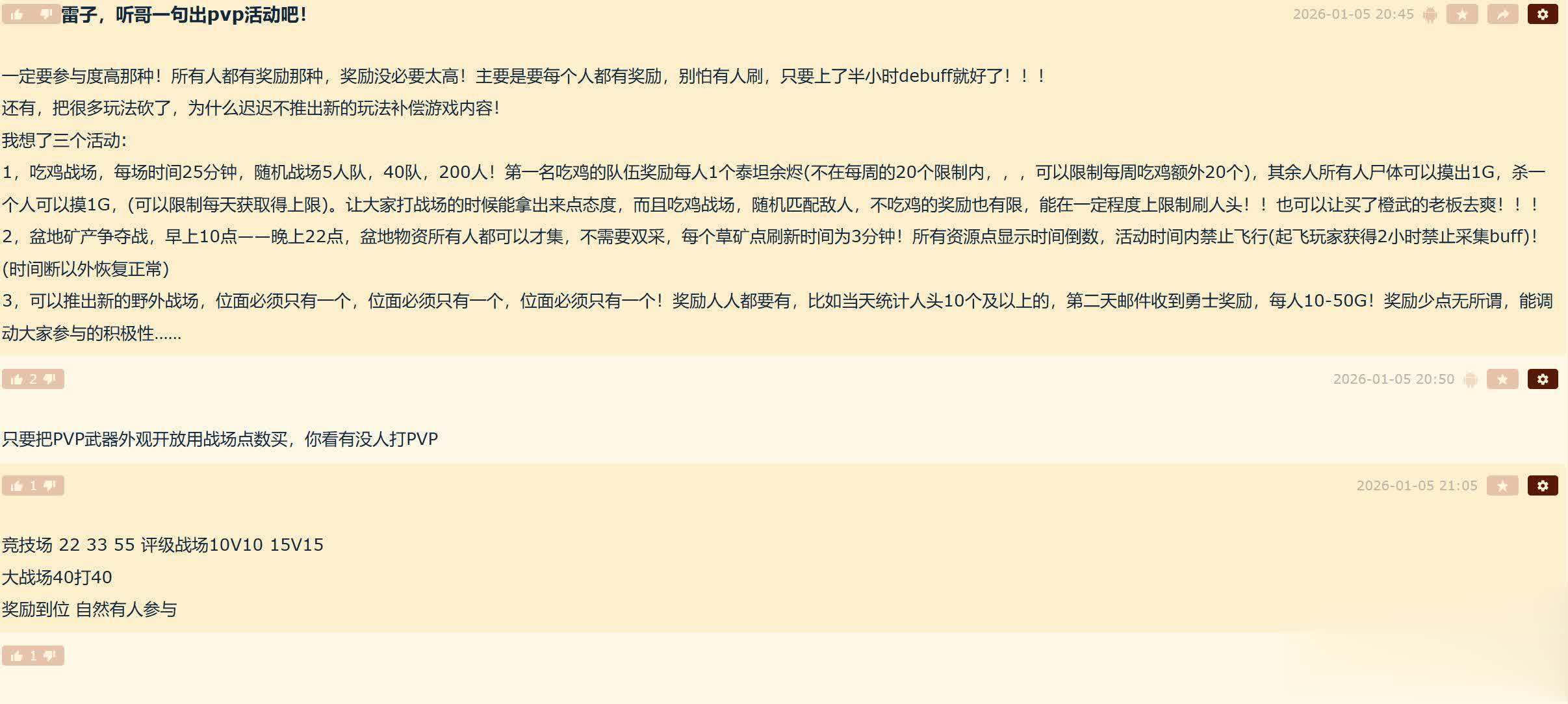 也有玩家回帖称,激活PVP人气很简单,开放PVP武器外观并用战场点数购买,不仅PVP装备,非PVP装备也可。因时光服取消韧性,目前打PVP收益低,劝退不少玩家,只要雷火奖励跟上,玩家就会参与。