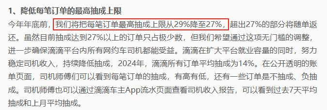 滴滴出行表示,今年年底前,将把每笔订单最高抽成上限从29%降至27%,超出27%的部分将随单返还。虽然目前抽成达到27%以上的订单只占极少数,但希望通过这项无门槛的调整,进一步确保滴滴平台内所有网约车司机都能受益。
