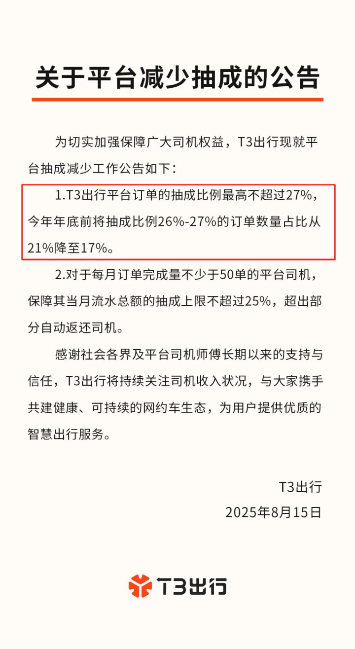 T3出行同时表示,对于每月订单完成量不少于50单的司机,保障其当月流水总额的抽成上限不超过25%,超出部分自动返还司机。